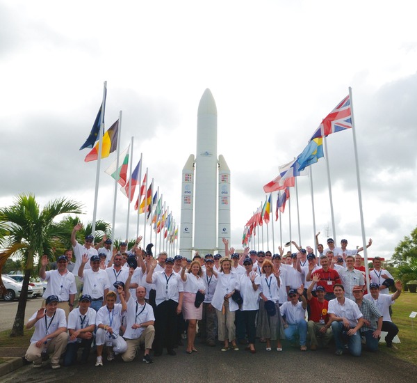 The Herschel and Planck launch campaign team members present at the European spaceport in Kourou, gathered in front of the full-scale Ariane 5 launcher model for a group photo.
