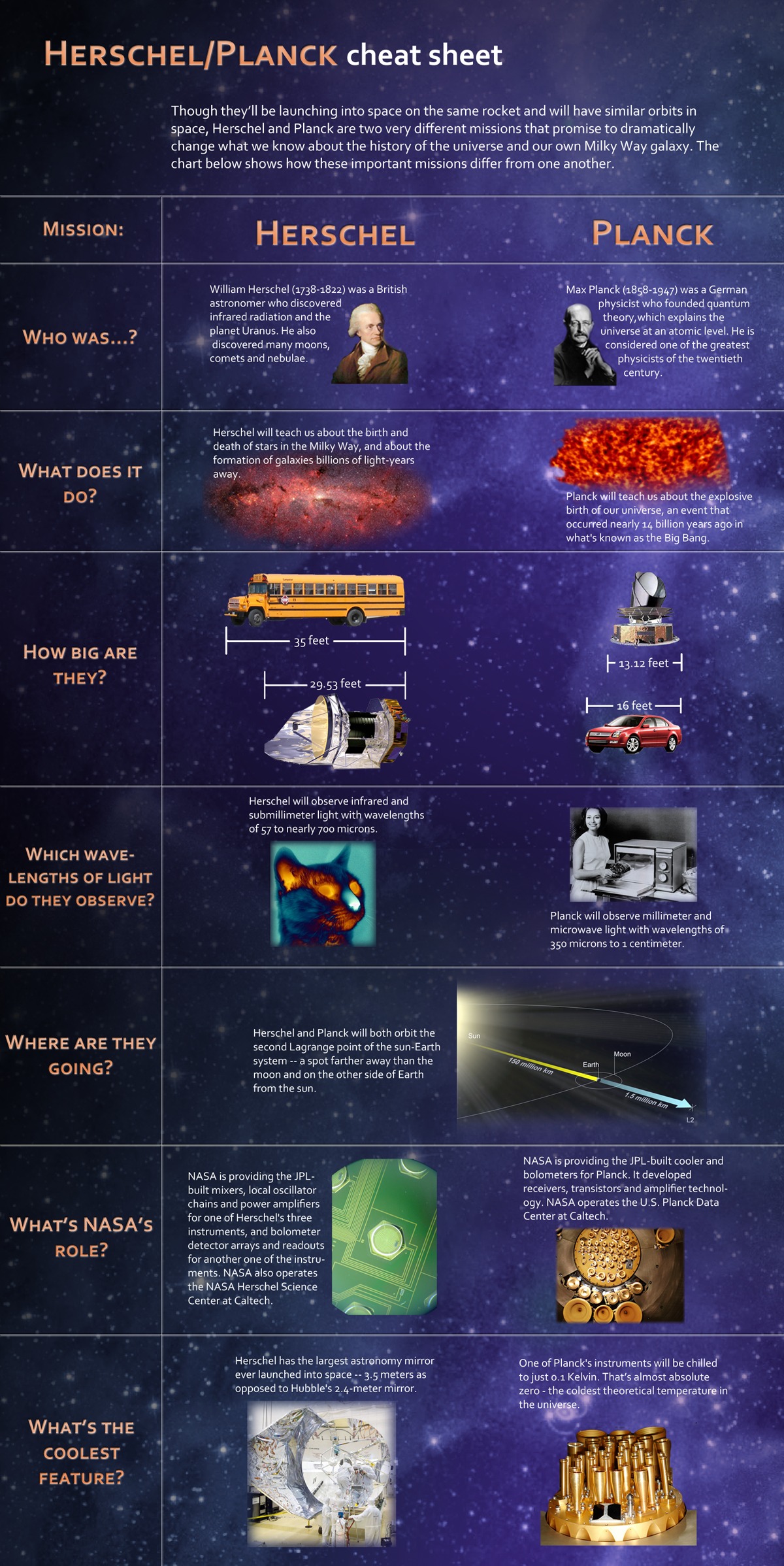 Though they'll be launching into space on the same rocket and will have similar orbits in space, Herschel and Planck are two very different missions that promise to dramatically change what we know about the history of the universe and our own Milky Way galaxy. This chart shows how these important missions differ from one another.