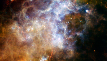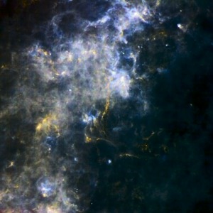 This image from the Herschel Observatory reveals some of the coldest and darkest material in our galaxy. The choppy clouds of gas and dust pictured here are just starting to condense into new stars. The yellow filaments show the coldest dust dotted with the youngest embryonic stars.