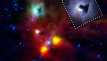 The dark hole seen in the green cloud at the top of this image was likely carved out by multiple jets and blasts of radiation. The hole was originally thought to be a really dark cloud, but this new infrared picture from the Herschel space observatory and the National Optical Astronomy Observatory on Kitt Peak near Tucson, reveals that the dark spot is actually a gap in a "nest" of gas and dust containing fledgling stars. Herschel's infrared eyes are designed to see into clouds, so the fact that it saw a dark patch of space told astronomers that they were indeed looking at a hole.
