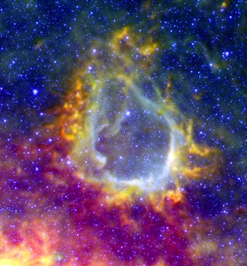 This image shows a composite of RCW 120 with data from Herschel Space Observatory and Spitzer Space Telescope. In the composite image red and yellow show cool dust, seen by Herschel. Bluer colors show warmer dust detected by Spitzer, as well as stars which are either in front of or behind the ring.