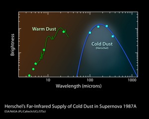 This plot shows energy emitted from a supernova remnant called SN 1987A. Previously, NASA's Spitzer Space Telescope detected warm dust around the object. This dust formed before the explosion, but as shock waves impacted pre-existing dust grains, they heated up. In contrast, the Herschel Space Observatory, which sees longer wavelengths of infrared light than Spitzer, detected cold dust that formed after the explosion. A large amount of this dust is made from the gas ejected by the supernova itself. The formation of this dust started at least two years after the explosion, while gaseous material slowly expanded from the center of the supernova remnant. Dust continued to cool and release light at the longer infrared wavelengths Herschel sees.