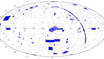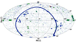 During the science operations phase, between May 2009 and April 2013, PACS mapped about eight per cent of the sky in far-infrared broad-band filters centred at 70, 100 and 160 microns with spatial resolutions of 5.6", 6.8" and 11.3", respectively. The 70-micron sources are plotted in blue, the 100-micron sources in green, and the 160-micron sources in red. The data points are plotted in the order red, green, blue, and since all the green and blue areas were also observed in the red band this results in only a few red regions being visible.