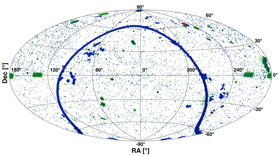 The distinctive band reflects the dense observation coverage along the Galactic Plane.