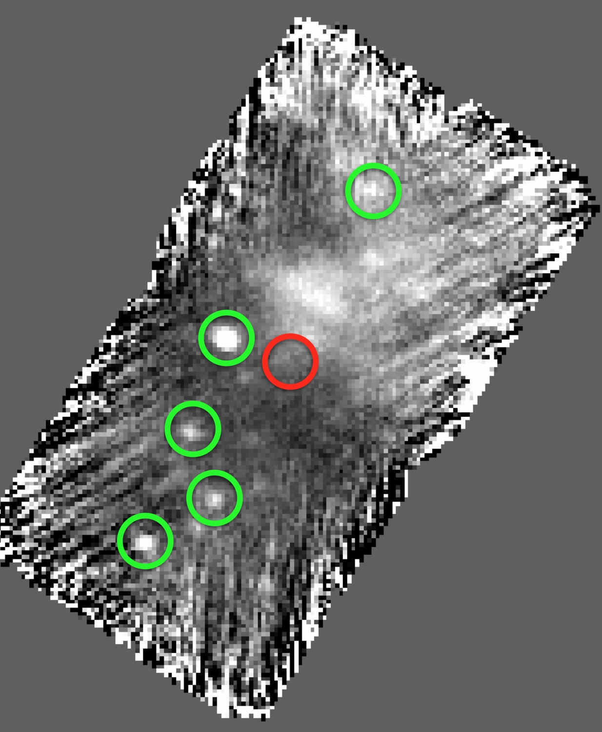This 160 m PACS map of the region of sky containing the Solar System object (248835) 2006 SX368 (position indicated with the red circle) demonstrates one of the strengths of the PACS point source catalogue: from the observation made by PACS, a pair of 70 m and 160 m maps were created for the purpose of studying this minor planet. Although the target object was too faint at 160 m to be detected a number of other celestial sources (indicated with the green circles) were found within the field of view these had not been catalogued before.
